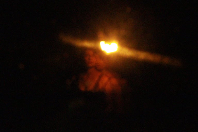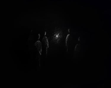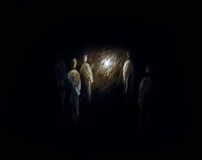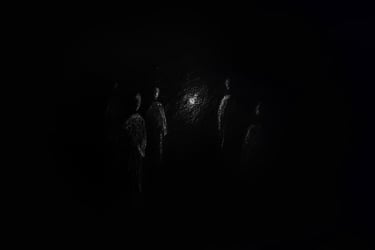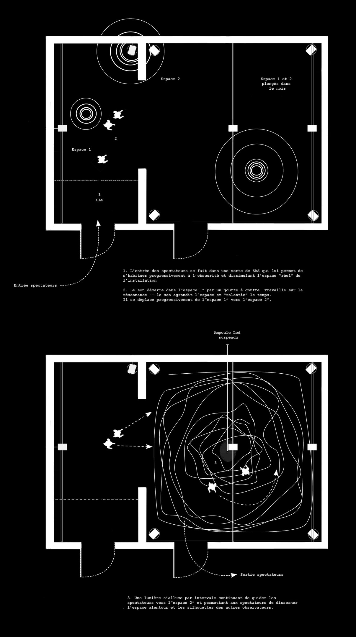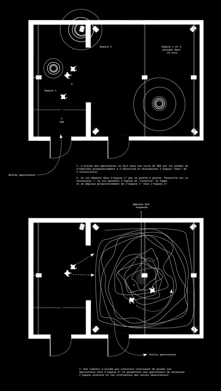 Plongé.e.s dans le noir, les spectateur.rice.s embarquent, guidé.e.s aux sont des vagues et par la voix de narrateur.rice.s. Au centre de cet espace vide : une lueur parfois chancelante nous laisse apercevoir les autres voyageur.se.s.